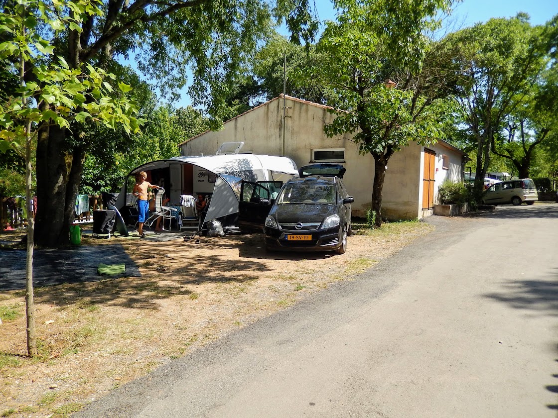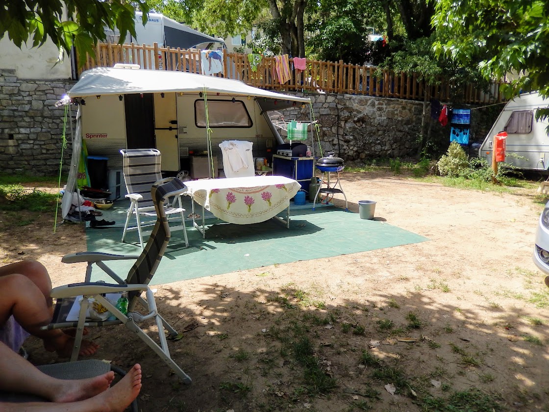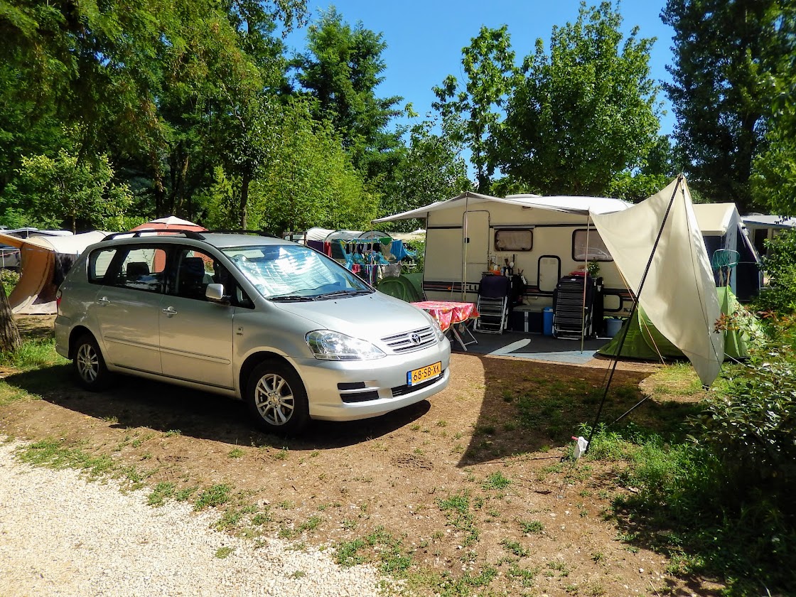 De meeste plaatsen zijn niet heel ruim. Wij hadden een gemiddelde plek van ongeveer 80 m2 en daar kon onze Knaus 500 (totale lengte ruim 7 meter) in de breedte mooi staan. Aan beide kanten niet veel ruimte meer over. De auto en bijzettent moesten voor de luifel staan. Wij hebben er overigens alleen een luifel voor. Met zo’n tandemasser met voortent en luifel heb je ws wel een grotere plek nodig. Je kunt de auto evt. buiten de camping parkeren.